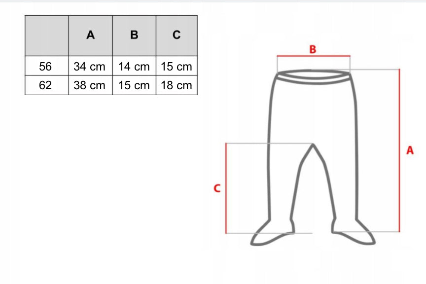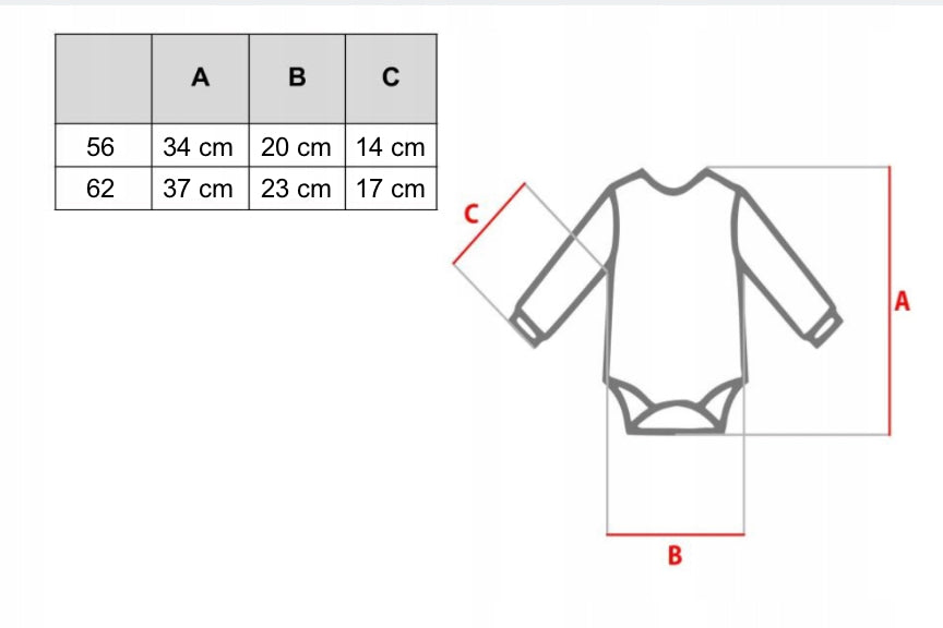 Dydžiai: 56 — tinkamiausias išnešiotam naujagimiui; 62 – geriausias pasirinkimas dovanai, kai mažylis jau priima svečius namuose.