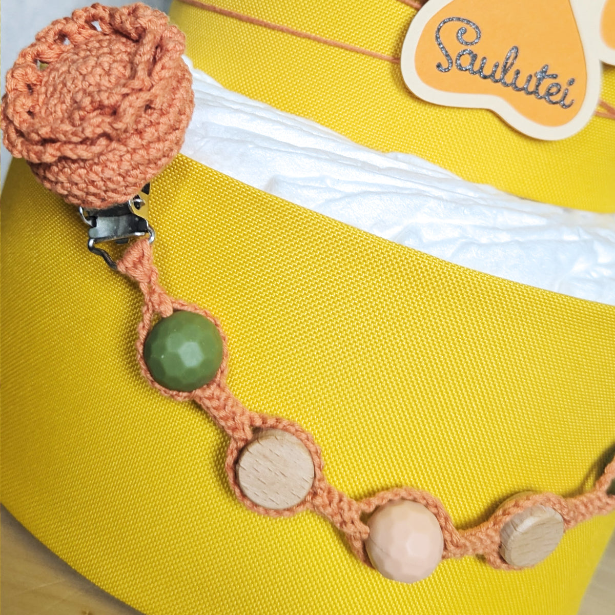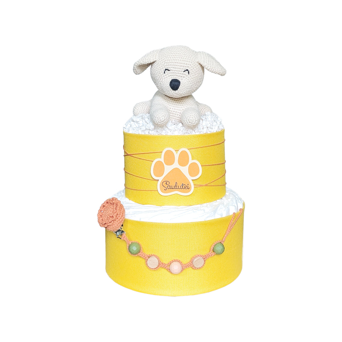 Šis tortas papuoštas rankų darbo nertu žaisliuku ir čiulptuko laikikliu, taip pat pridėta vardo kortelė.