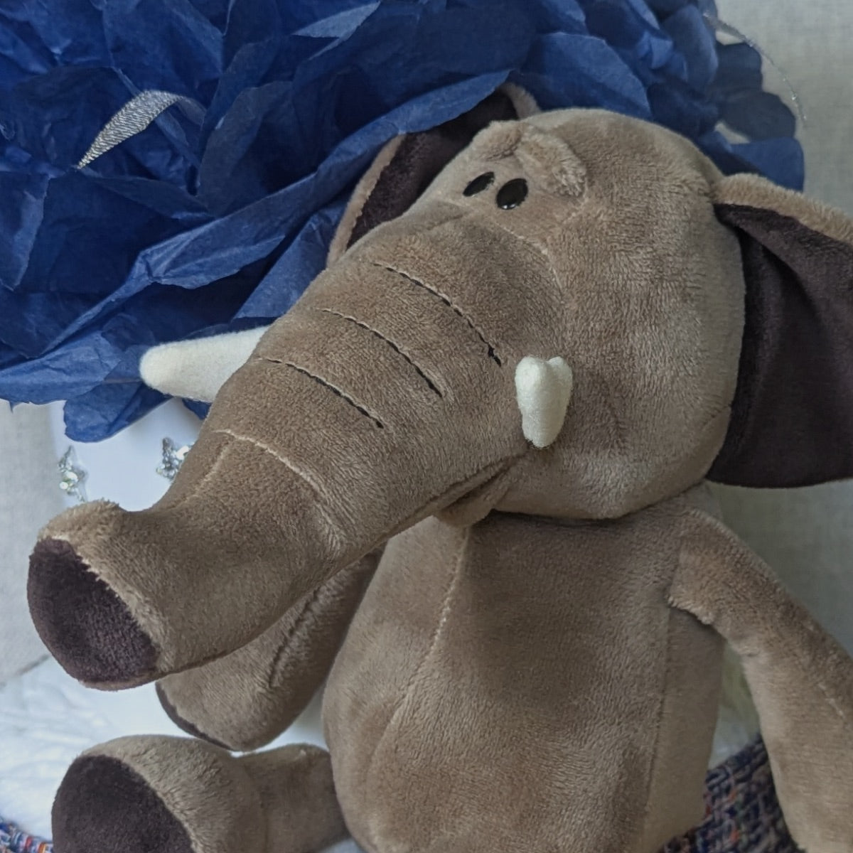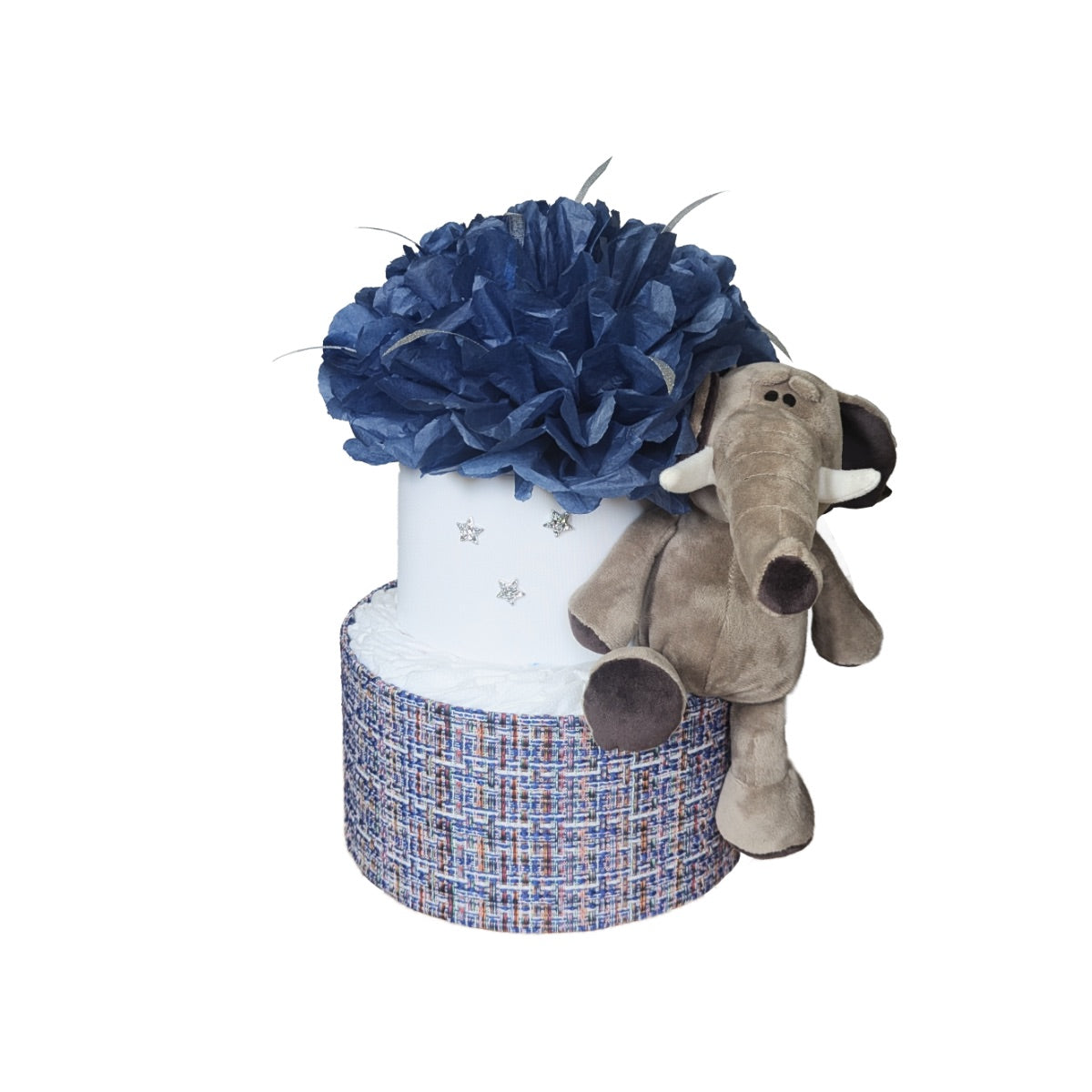 Viršutinė dalis papuošta žvaigždutėmis ir puriu mėlynu gėlių žiedu, o apačią juosia stilingas audinys, primenantis šiltą pledą. Torto šone įsitaisęs pliušinis drambliukas tarsi saugo saldų kūdikio miegą. Tai puiki dovana, kuri ne tik pravers, bet ir sukurs jaukią atmosferą.