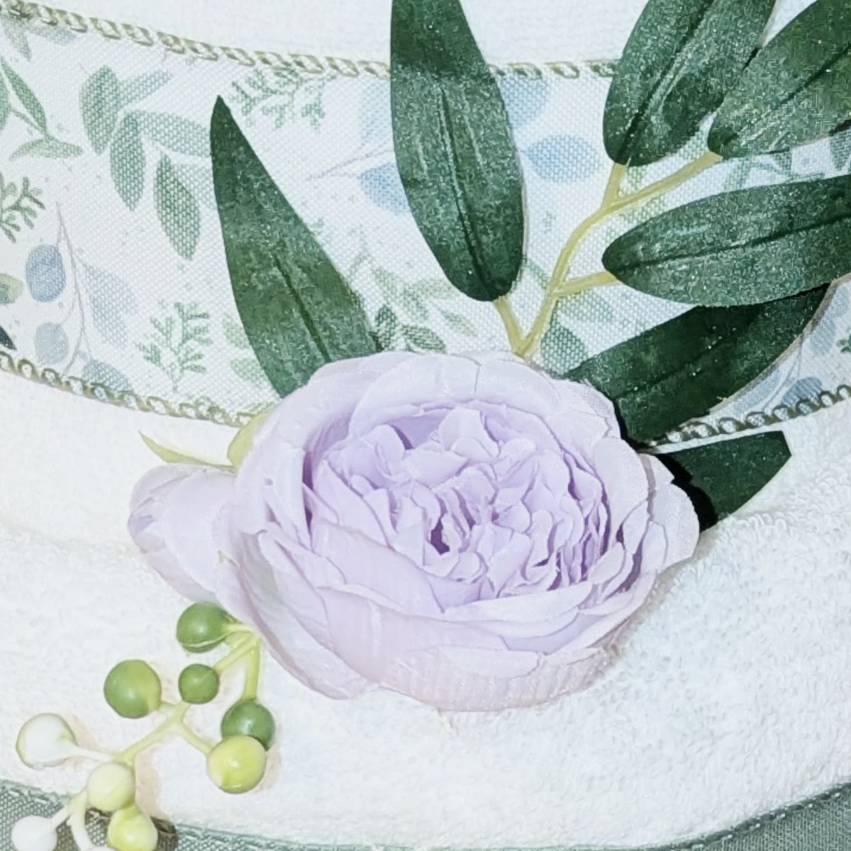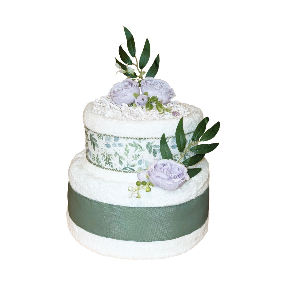 Šis sauskelnių tortas tiks ir mergaitei ir berniukui. Jis apjuostas minkštais rankščluosčiais ir papuoštais alyvų spalvos žiedais.